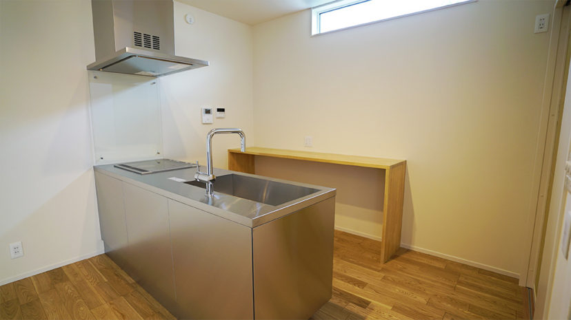 後入れの食器棚や家具との相性も考え、壁際の造作カウンターはあえて作り込まずシンプルに仕上げました。キッチン周りをお客様自身でアレンジできる楽しさを残してあります。