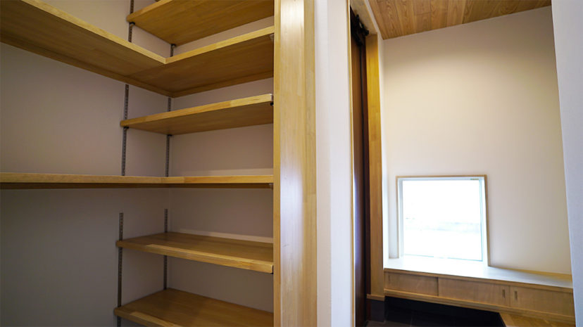 また、造作家具や無垢天井など自然素材をふんだんに使い、室内に入った瞬間から心地よさに包まれる玄関となっています。
