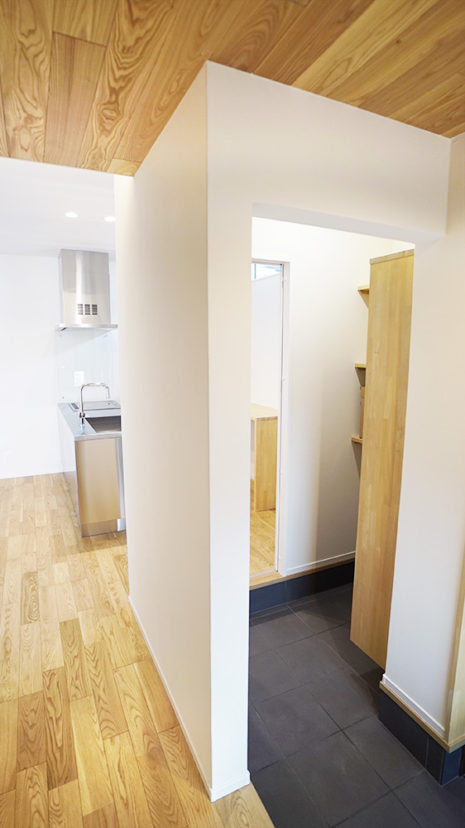 玄関からキッチン、リビングへの2way動線となります。動線をしっかりと備えた住まいは無意識に無駄な動きが減り、ストレスフリーに日々の生活を過ごせます。
